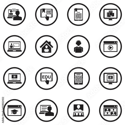 E-learning Icons. Black Flat Design In Circle. Vector Illustration.