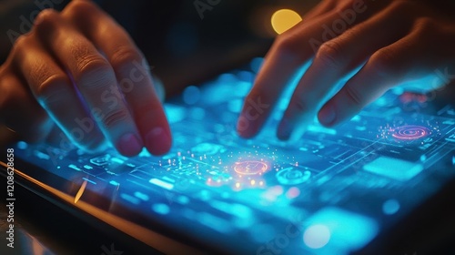 E-learning on tablet, close-up of interactive lessons on a tablet screen, hands navigating the platform