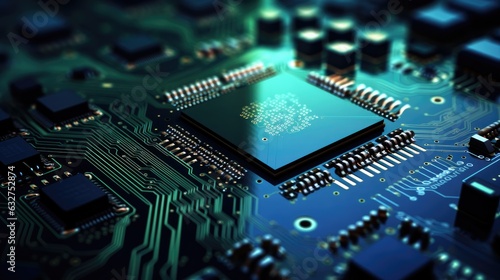 electronic circuit board with a microchip processor, for data processing in a Technology-themed image as a JPG horizontal format. Generative AI