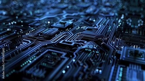 Electronic circuit board with glowing connections and components representing data processing, information technology, and the intricate world of computer hardware