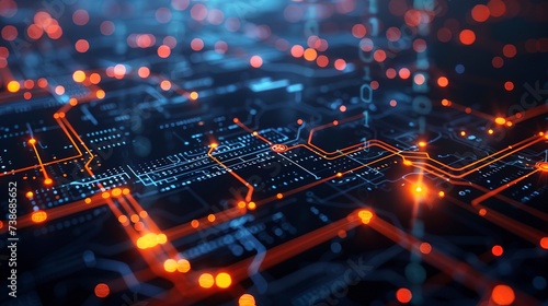 Electronic Circuit Board with Glowing Red Connections