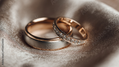 Elegant Close-Up of Two Wedding Rings on Soft Satin Fabric with Gentle Bokeh Effect for Romantic Celebrations and Moments