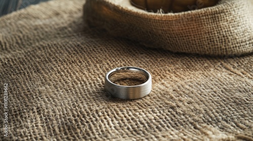 Elegant Silver Ring on Rustic Burlap Texture Background