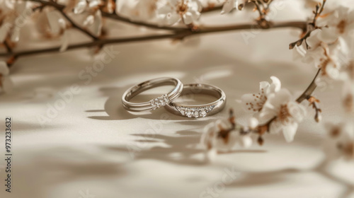 Elegant Wedding Rings Amidst Blossoming Branches on Neutral Background