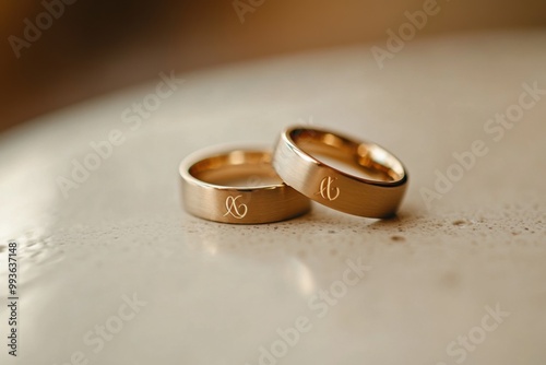 Elegant wedding rings with personalized engravings on a simple surface