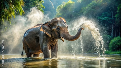 Elephant bathing in river with water spraying, freshwater, habitat, freshwater, habitat, nature scene , river, bathing