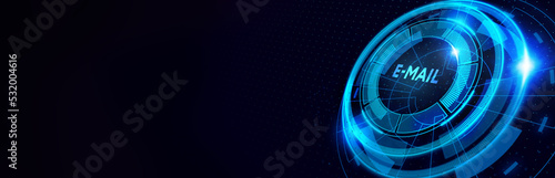 Email communication. Upgrade. Update software computer program. Young businessman select the icon E-mail on the virtual display. 3d illustration