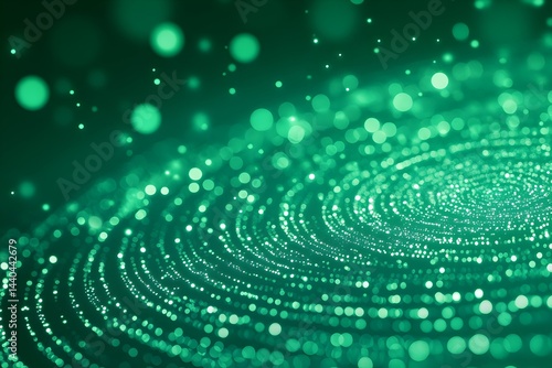 Emerald green swirling particles, glowing bokeh effect, dark background
