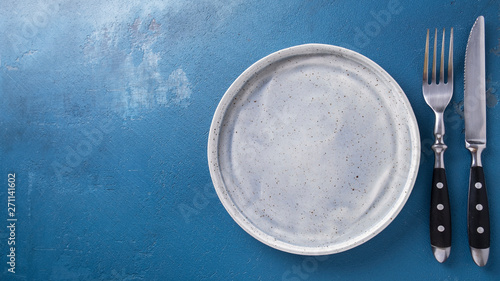 Empty grey plate with fork and knife on a blue background. Top view. Space for text