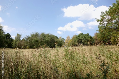 Empty plot in meadow, overgrown with thickets, grass.