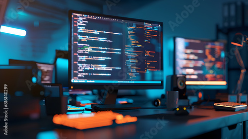 Empty Software Developer Office Workplace with a Desk with Multiple Computer Screen with Programming Code Big Data Models BackEnd of Artificial Intelligence and Neural Network Technolo : Generative AI