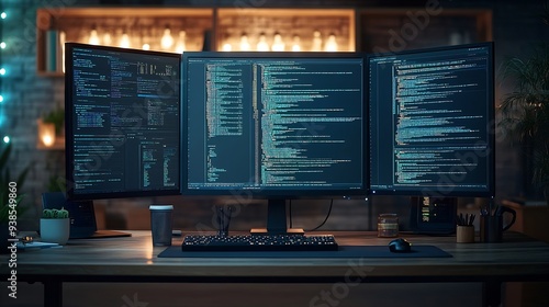 Empty Software Developer Office Workplace with a Desk with Multiple Computer Screen with Programming Code Big Data Models BackEnd of Artificial Intelligence and Neural Network Technolo : Generative AI