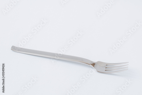 Empty steel fork on white background, copy space