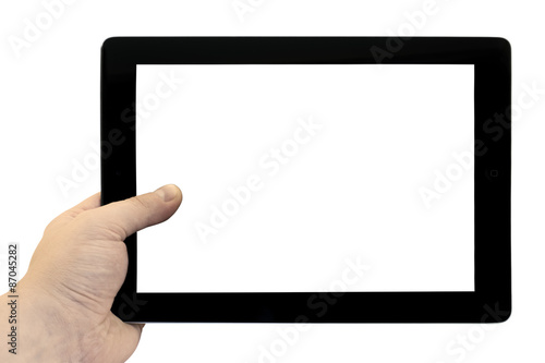 Empty tablet PC in hand isolated on white