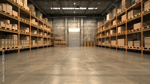 Empty Warehouse with Cardboard Boxes on Shelves.