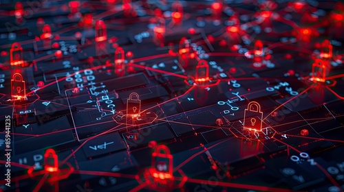 Encrypted network connections shown with digital lines and padlocks in a 3D render