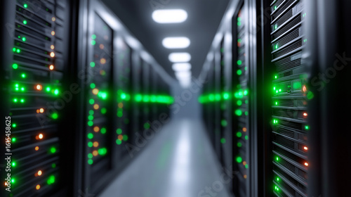Endless black server racks with green status LEDs in data center