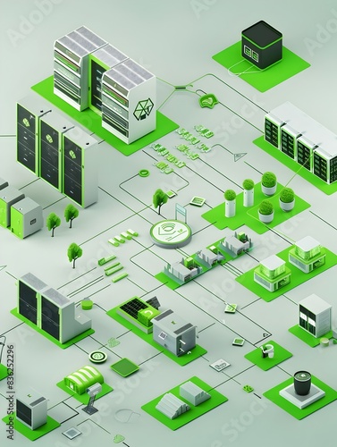 Energy Efficient 3D Rendered Data Center Diagram with Green Elements and Eco Friendly Icons