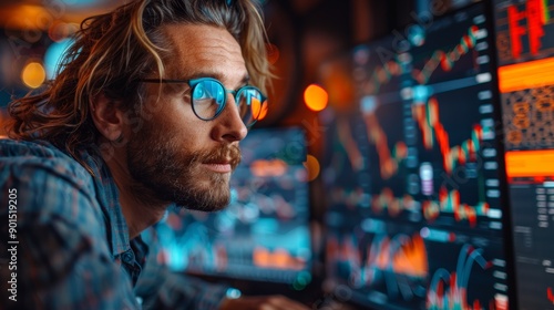 Engaged Analyst Monitoring Stock Market Trends With Multiple Screens During Evening Hours in a Modern Office Setting. Generative AI