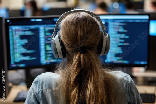 Engaged Programmer Immersed in Coding Tutorial Session While Wearing Headphones and Concentrating on Multiple Computer Monitors in a Modern Workspace