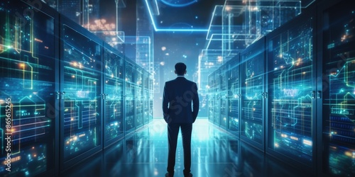 Engineer connecting data center on global networking in server room of storage systems and connect of data on internet network business