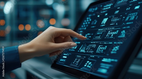 Engineer Energy Tablet concept. Industrial Engineer Monitoring Factory Energy Usage on Digital Dashboard