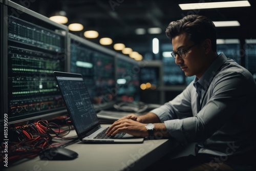 engineer man controls machine with laptop managed by programmed controller