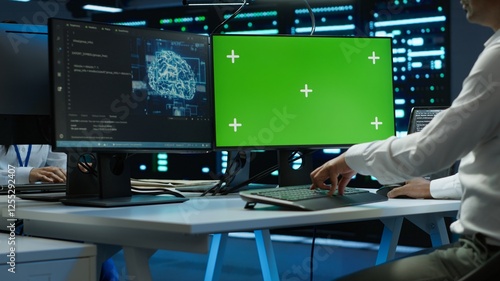 Engineer using AI tech on green screen PC to do checkup in server room. Zoom in of expert in data center using artificial intelligence on mockup computer to process datasets for training, camera A