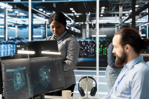 Engineers doing maintenance on blade servers supplying compute power for AI data processing and inference workloads. IT experts overseeing data center arrays managing training datasets