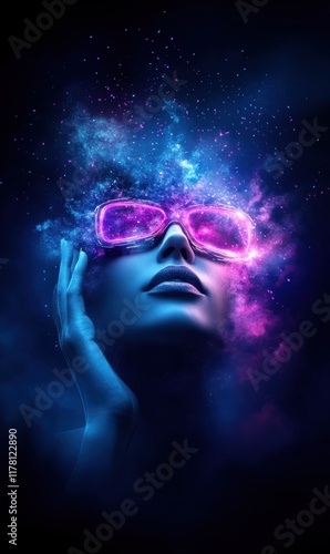 Enigmatic Portrait of a Woman with Cosmic Glasses Surrounded by Vibrant Galactic Nebula Elements