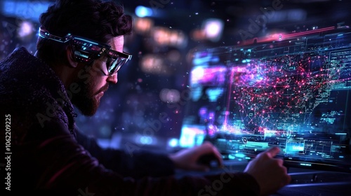 Enthusiastic Programmer Analyzes Complex Data Patterns Using Advanced Technology in a Futuristic Setting to Enhance Digital Innovation