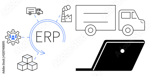 ERP in center connecting gears, factory, laptop, delivery trucks, and boxes. Ideal for business management, logistics, supply chain, manufacturing technology automation efficiency concepts
