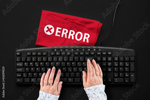 ERROR. Woman hands on pc keyboard and error word on rag