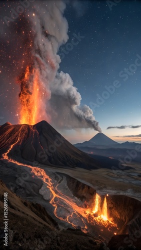 Erupting Volcano with Flowing Lava at Dusk