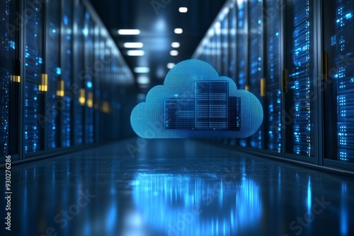 Ethereal cloud data center illuminated in blue showcasing the vast network of cloud computing resources