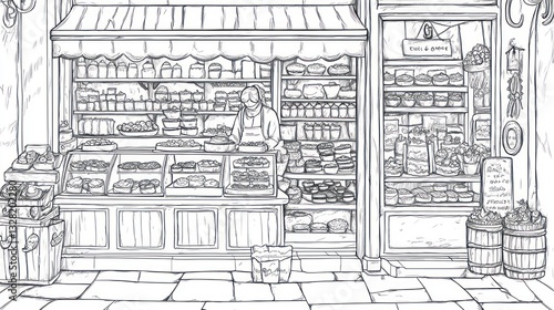 European bakery sketch, shop scene, food display, coloring page, illustration