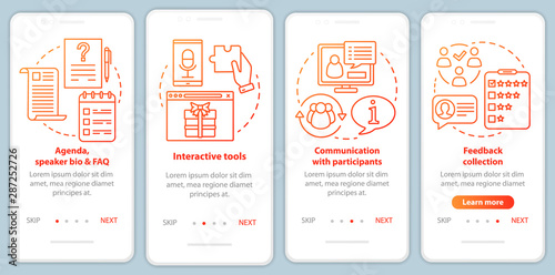 Event onboarding mobile app page screen with linear concepts. Interactive tools, communication with participants walkthrough steps graphic instructions. UX, UI, GUI vector template with illustrations