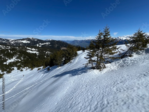 Evergreen forest with coniferous trees and alpine pastures in a winter environment of the Swiss Alps and UNESCO Biosphere Entlebuch, Switzerland - Immergrüner Nadelwald und Almwiesen