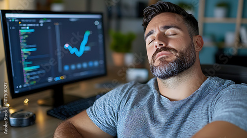 Exhausted office worker struggles with cluttered desk amidst data charts modern workspace stressful environment overwhelmed viewpoint