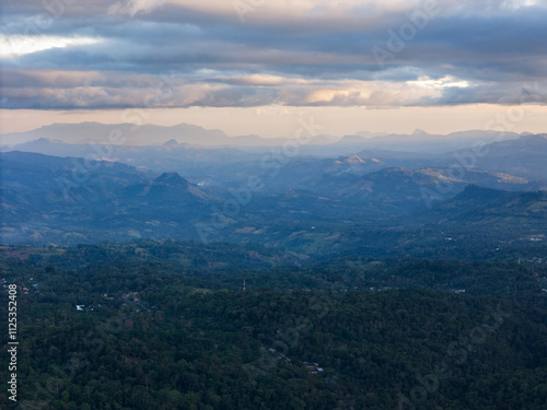 Expansive mountain landscape under dramatic sky at dusk