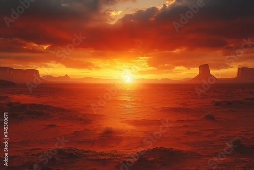 Expansive sunset over desert landscape with dramatic clouds and distant rock formations