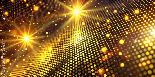 Experience a stunning 4K animation with a background of glowing golden dots and halftone plexus forms, radiating starlight for an enchanting visual effect.