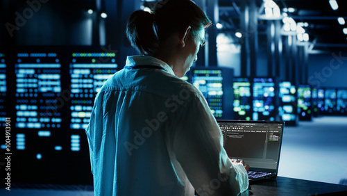 Experienced engineer running programming code on laptop, troubleshooting and updating data center equipment designed to accommodate server clusters, networking systems and storage arrays