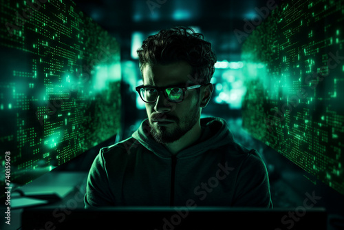 Experienced hacker in action breaking software protection server code Generative Ai image pic