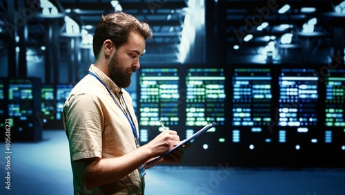Experienced system administrator maintenancing interlinked computers creating server network. Data storage service business using parallel computing to perform complex calculations