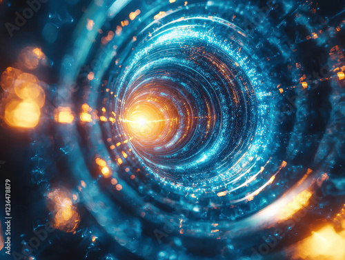 Exploring quantum wave function collapse with dynamic light spirals and energetic bursts in a surreal, futuristic environment