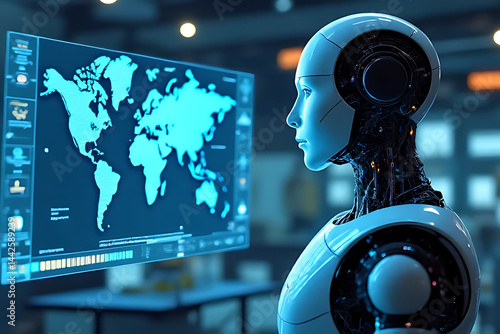 Exploring robotic interaction global technology hub digital art futuristic setting side perspective