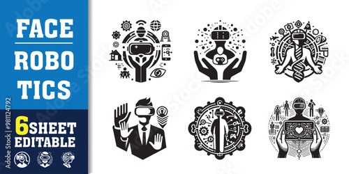 Face robotics Artificial intelligence icon collection. machine learning, data science, AI, virtual assistant, generative AI, technology. Line vector icons set.