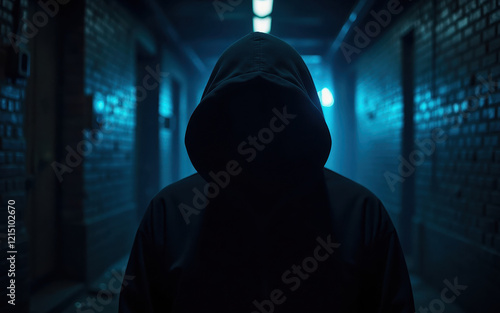 faceless figure in a black hood in a brick corridor with Light Blue lighting