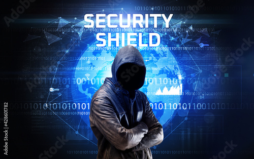 Faceless hacker at work, security concept